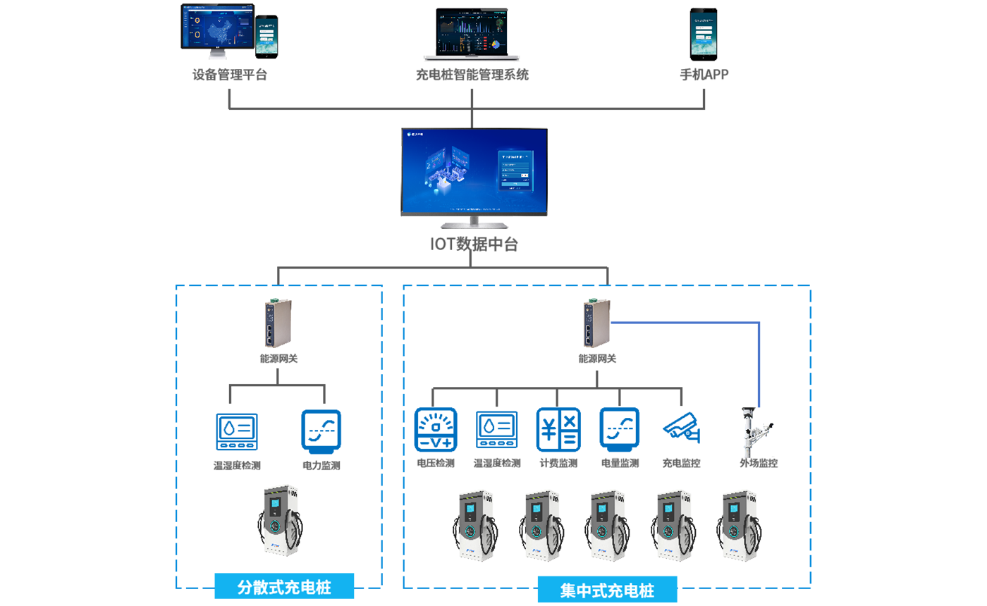 顺利获得yth游艇会yth206的工业智能网关将充电桩的运行数据(如充电状态、电压、电流、故障信息等)采集并实时传输至充电桩远程监控管理平台。平台对充电桩状态进行监测,统计充电数据,当充电桩出现故障时及时发出预警并给予故障处理指导。同时支持远程参数配置、用户服务管理和运营数据分析功能。