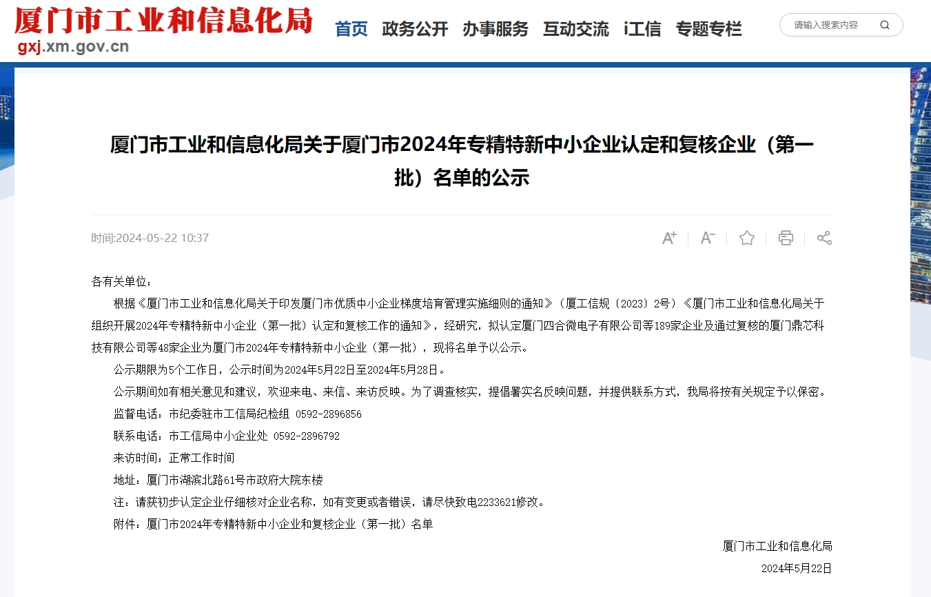5月22日,厦门市工业和信息化局公布了《关于厦门市2024年专精特新中小企业认定和复核企业(第一批)名单的公示》,厦门yth游艇会yth206网络科技有限公司成功顺利获得2024年度厦门市专精特新中小企业认定。