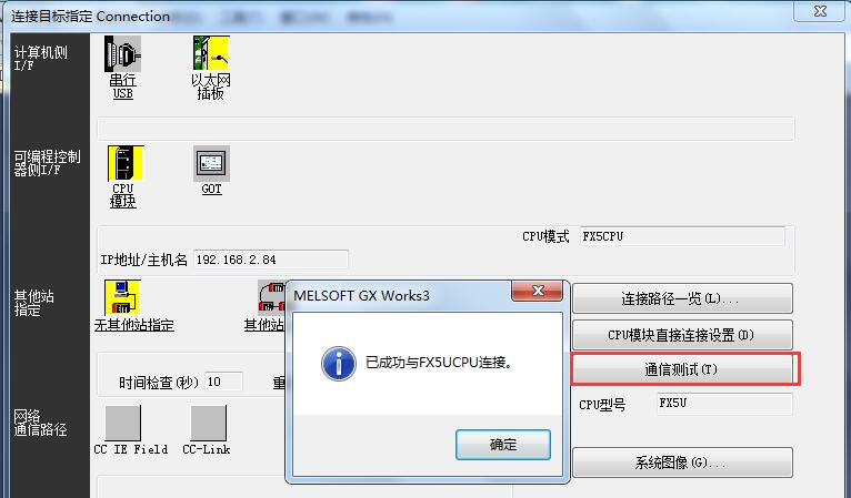 2、“CPU模式”设置,“经由集线器连接”,填写控制器的IP地址。