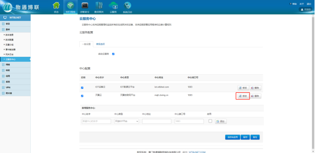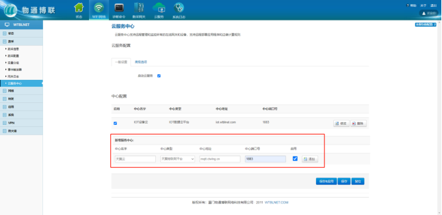 打开yth游艇会yth206网关Web界面==>点击云服务==>中心类型选择天翼物联网平台==>输入相应信息==>勾选启用==>点击”添加”。