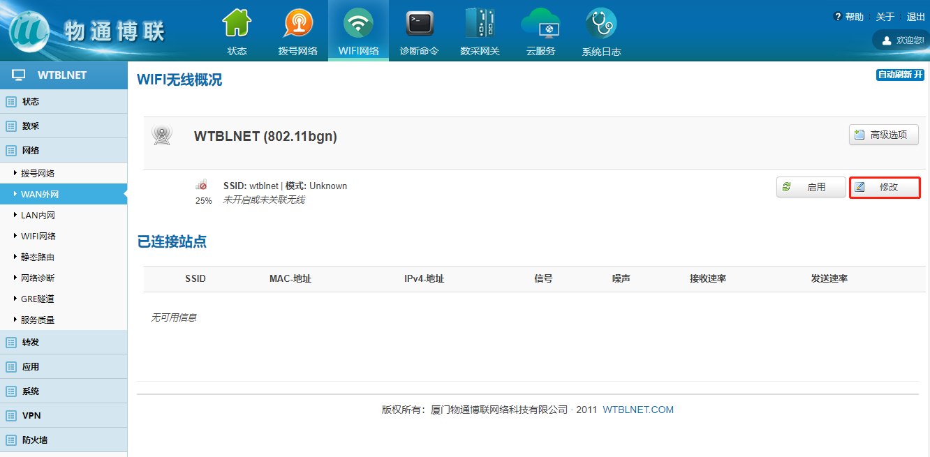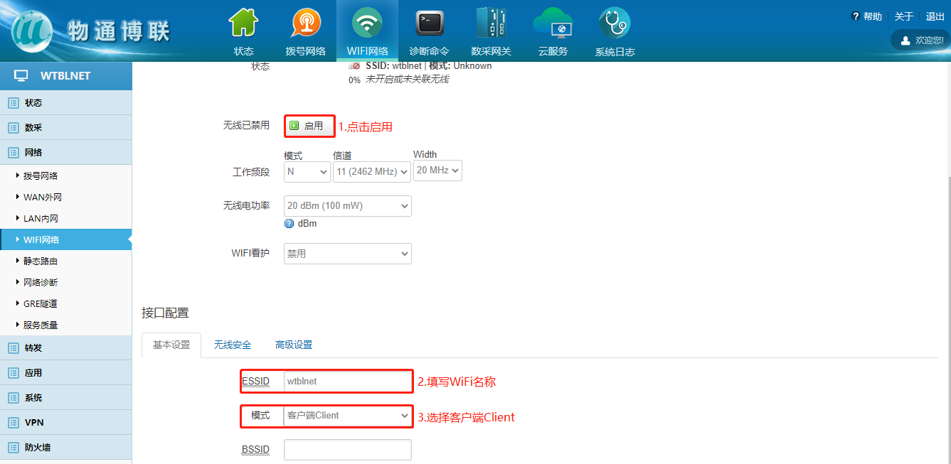 下载中心 视频中心 常见问题 售后服务 工业网关 设备快线 数据云平台 联网设备 问答百科 工业智能网关如何连接wifi热点? 时间:2022-10-26 09:15:30 点击:8221 关键词:工业智能网关,wifi 问题:工业智能网关如何连接wifi热点? 回答: (1)电脑顺利获得网线接入到网关LAN口,浏览器输入192.168.2.1默认地址 (2)登陆网关配置界面选择WiFi网络 (3)点击WiFi界面修改—进入WiFi配置界面 (4)启用WiFi—填写ESSID(WiFi名称)—模式选择客户端Client (5)点击无线安全—输入WiFi密码 注意:WiFi获取到的IP网段与网关LAN口的IP网段不能重复! 上一篇:工业智能网关如何更新程序和固件? 下一篇: 工业智能网关如何使用流量卡上网?
