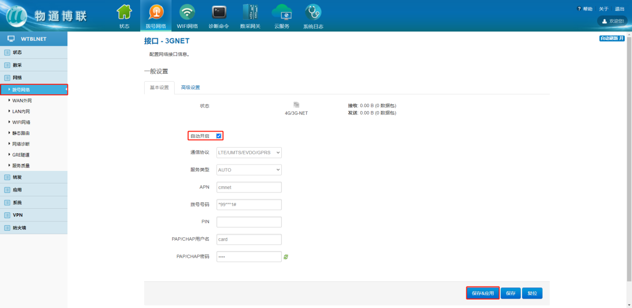 下载中心 视频中心 常见问题 售后服务 工业网关 设备快线 数据云平台 联网设备 问答百科 工业智能网关如何使用流量卡上网? 时间:2022-10-26 09:15:30 点击:7691 关键词:工业网关,流量卡,网关配置 问题:工业智能网关如何使用流量卡上网? 回答: (1)电脑顺利获得网线接入到网关LAN口,浏览器输入192.168.2.1默认地址 (2)登陆到网关配置界面,点击网络—拨号网络—自动开启—保存应用 上一篇:工业智能网关如何连接wifi热点? 下一篇: 工业智能网关如何使用网线上网?