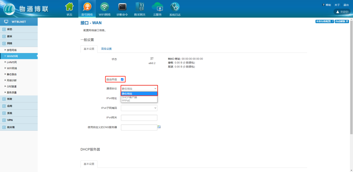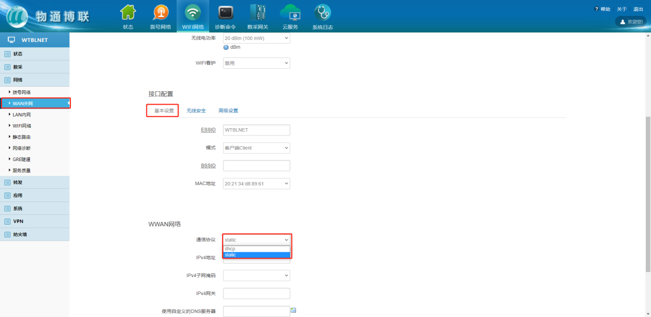 下载中心 视频中心 常见问题 售后服务 工业网关 设备快线 数据云平台 联网设备 问答百科 工业智能网关如何设置静态固定IP? 时间:2022-10-26 09:15:30 点击:7917 关键词:工业智能网关,静态固定IP,网关配置 问题:工业智能网关如何设置静态固定IP? 回答: (1)WAN外网设置静态IP 网络—WAN外网—切换通信协议——填写固定IP参数 (2)WiFi网络设置静态IP 网络—WiFi网络—修改—切换通信协议—填写静态IP 上一篇:工业智能网关如何使用网线上网? 下一篇: 工业智能网关如何进行软硬件复位?
