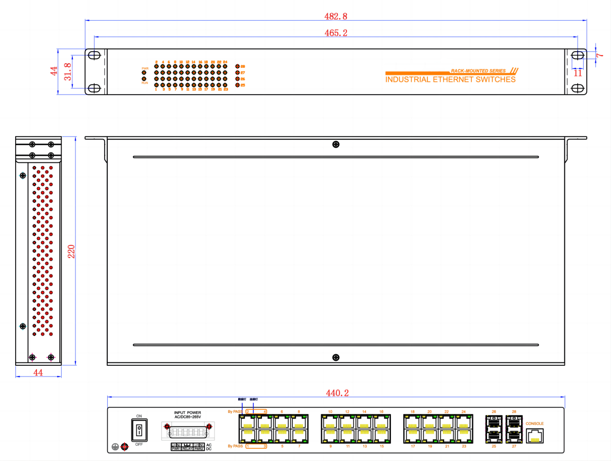 24个10/100/1000Base-T(X)自适应以太网RJ45接口 4个1000M SFP扩展槽 |