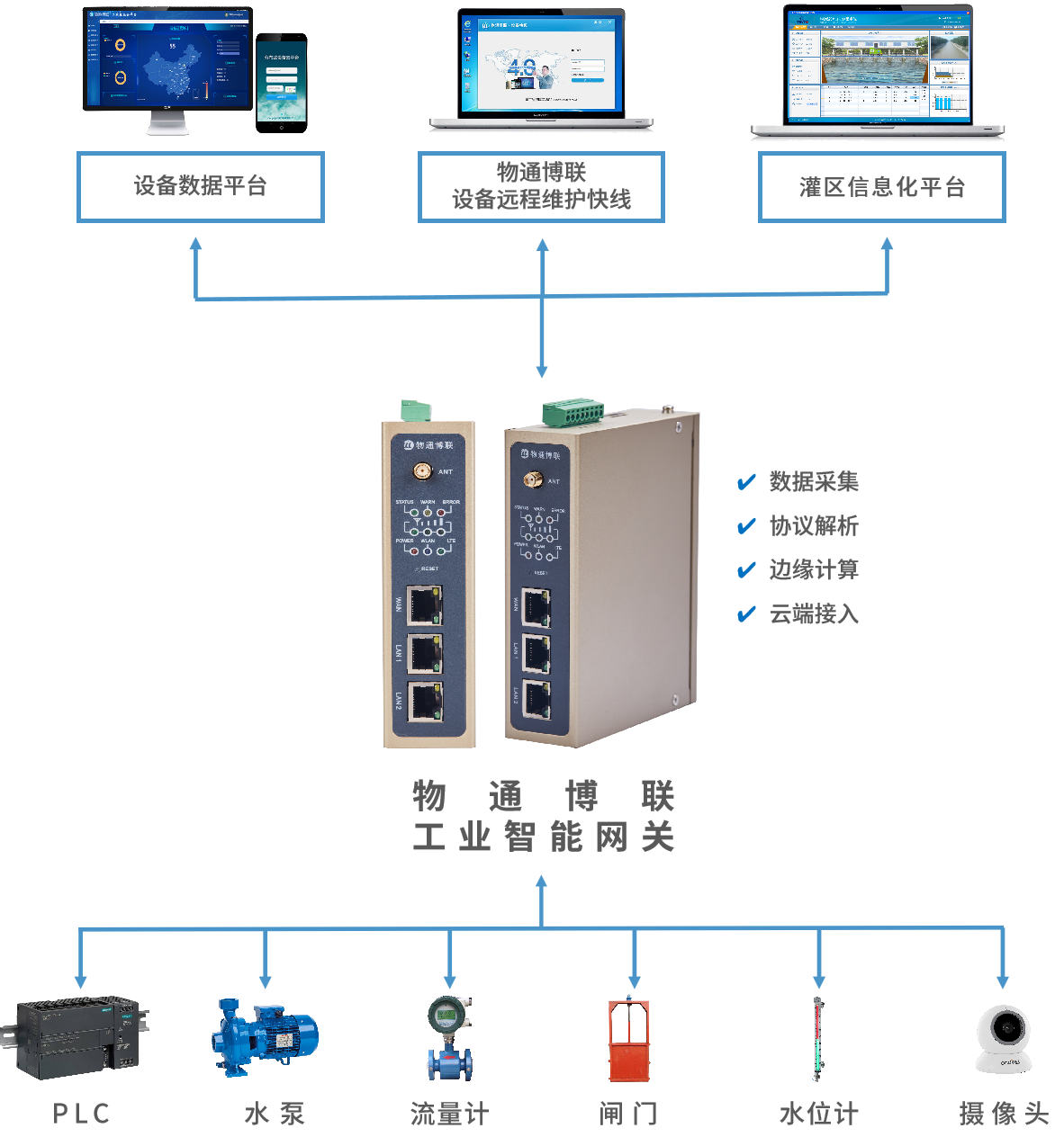 该系统顺利获得将农田大棚的温湿度传感器、流量计、雨量计、水肥一体机、水泵PLC等设备接入到工业智能网关中,进行数据采集和边缘计算,并将数据对接到智慧农业物联网平台中,从而实现可视化监控、远程控制、故障运维管理、数据分析等功能,实现水资源的综合利用与优化配置。