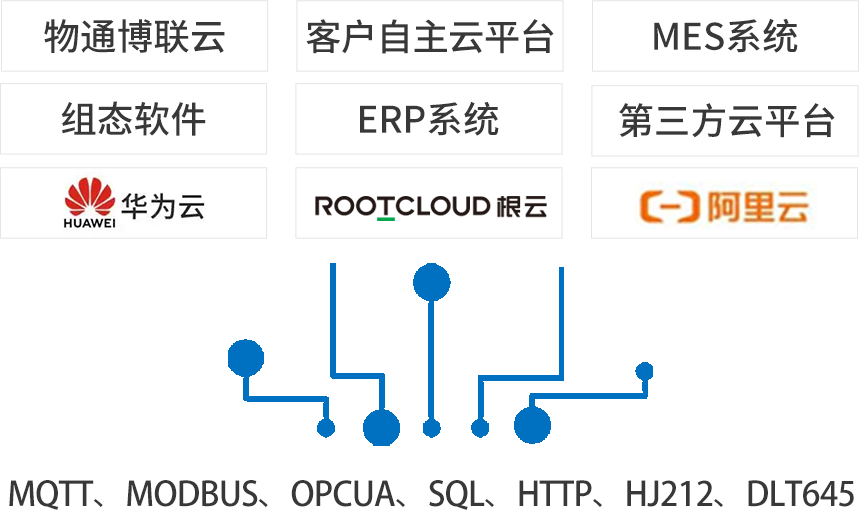 北向支持接入yth游艇会yth206云平台,客户自主开发的云平台,第三方云平台(根云、美云、华为、阿里、百度、微软等IOT云平台),组态软件、MES系统、ERP系统等工业软件