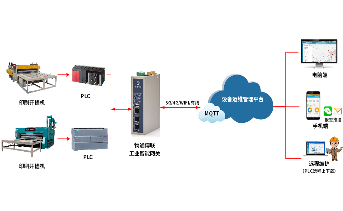 yth游艇会yth206利用WG系列工业智能网关作为连接设备和监控系统的桥梁,实现印刷机械设备数据的远程监控和维护,为印刷企业给予更加智能化的印刷机械设备远程监控智能运维解决方案。