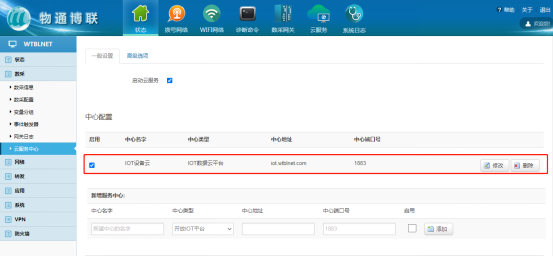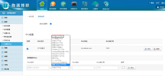 错误诊断 若采集的数据值为“NULL”,请排查接线是否正常,核对数采配置中设备通讯参数与变量参数信息是否正确。 若采集的数据值不正确,请核对变量类型及对应类型地址范围是否正确。 3 云服务配置 中心类型 (1)IOT数据云平台:为我司公网地址,数据可上传至我司IOT平台进行数据监控以及远程维护、远程部署配置。