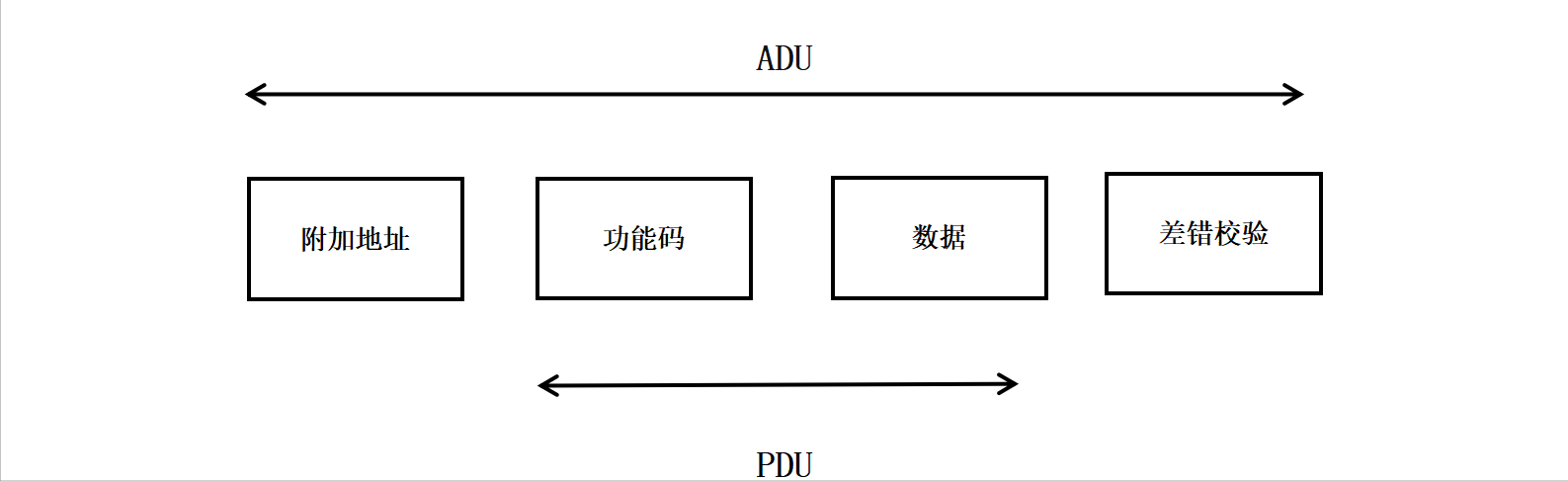 Modbus使用一种简单的MasterandSlave主从协议(客户机/服务器协议)进行通信。客户机作为主站,向服务器发送请求;服务器(从站)接到请求后,对请求进行分析并作出应答。其中使用的通信帧被称为应用数据单元(Application Data Unit,ADU),它包括通信地址段、功能代码段、数据段和校验段,如下图: