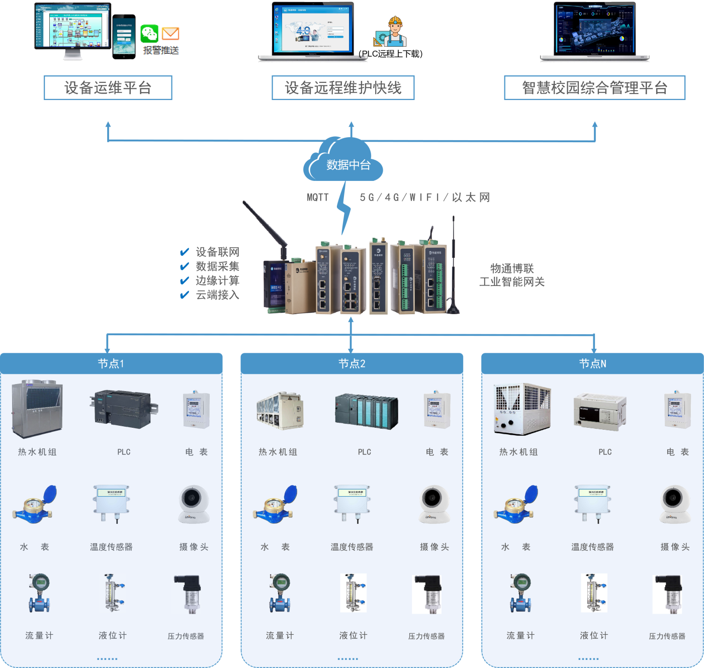 现场控制器PLC汇集温度传感器、液位传感器、溢流开关、电磁阀、水表、空气能设备、电表、变频器、水泵、继电器等设备,对这些设备进行逻辑控制,yth游艇会yth206工业智能网关顺利获得以太网/串口方式从现场设备采集设备的各项数据(设备运行状态、温度、液位、出水压力、耗电量、制热量)等信息,利用边缘计算能力对数据进行处理从而完成数据标准化,然后顺利获得4G网络把数据上传yth游艇会yth206数据中台,yth游艇会yth206数据中台将数据转发到设备远程监控管理系统,实时监控热水机站状态,支持对热水机组进行远程控制,实现不同时段、不同天气温合理调节机站运行状态、设置温度,支持故障报警,告警异常及时通知到运维人员,提前发现及时处理,提升服务质量,预防事故发生,降低运营成本,达到节能减排目的;同时yth游艇会yth206数据中台将数据接入到智慧校园综合管理平台和校园一卡通系统,方便学生和教职工使用,提高学校管理效率。