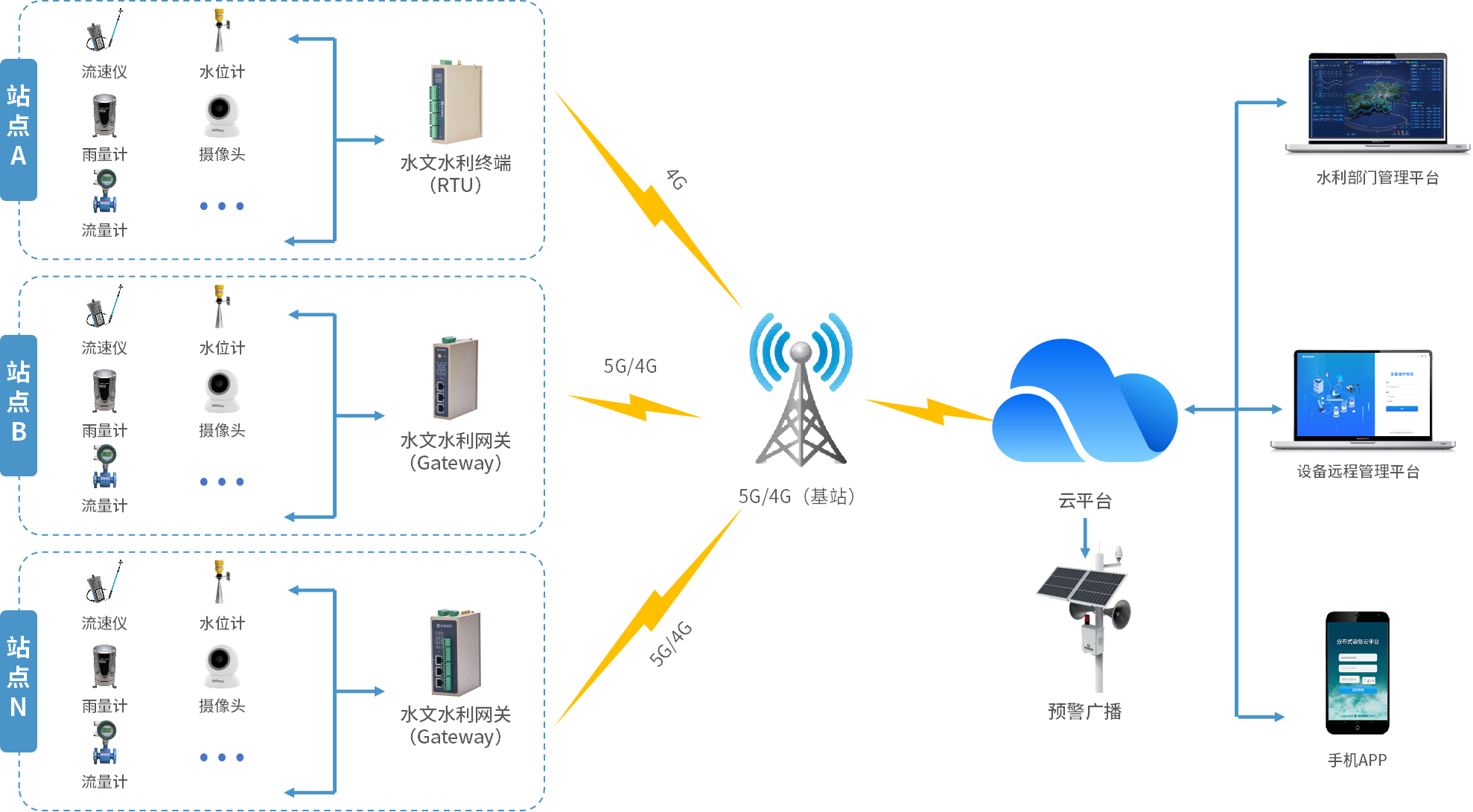 解决方案 yth游艇会yth206给予中小流域防汛防洪监测预警系统解决方案。顺利获得将水位计、流量计、雨量筒接入水利水文网关(RTU),实时采集水位、流量、雨量等数据并顺利获得 4G/5G等多种通讯方式实现传输汇聚到各级中小河流治理信息化管理平台,搭建起一张完整、精准、实时的水文监测网络,给予准确有效的防洪防汛预报预警,便于形成预案应对、灾害预演等数字化治理手段,加强中小流域防汛防洪治理水平与响应能力。
