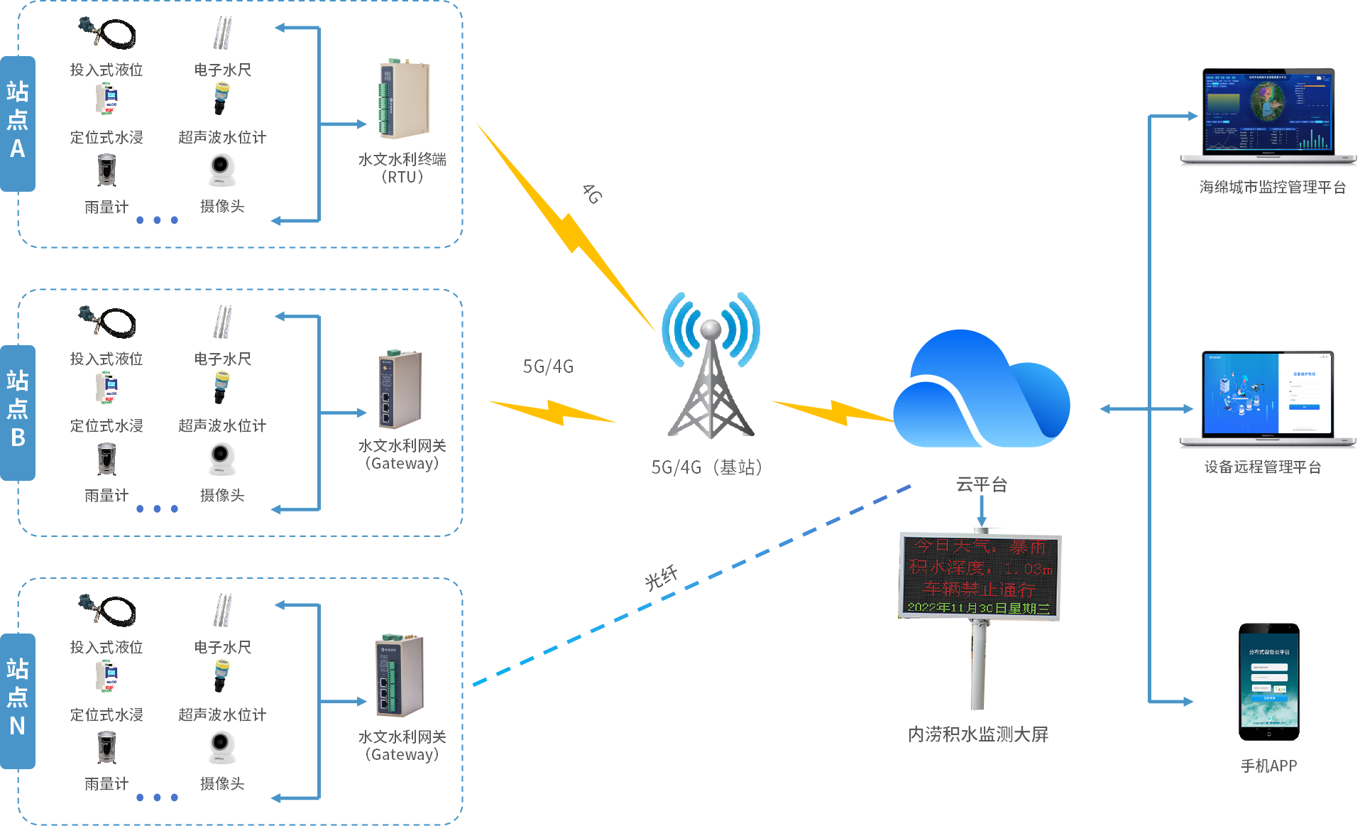 在城市关键区域(如低洼地带、排水系统关键节点、主要道路交叉口等)部署智能水位监测传感器、雨量计及视频监控设备,实时收集降雨量、水位变化、水流速度等数据,顺利获得yth游艇会yth206水文水利网关采集数据,并顺利获得5G/4G或光纤网络远程传送至城市内涝监测预警中心,实现实时监测,水位过高、设备异常时系统自动报警,并顺利获得手机短信等渠道自动向负责人发布预警信息,提醒相关部门采取相应措施解决所面临的积水问题,并借助广播、电视、LED显示屏等媒体为广大群众给予出行指南,避免人员、车辆误入深水路段造成重大损失。