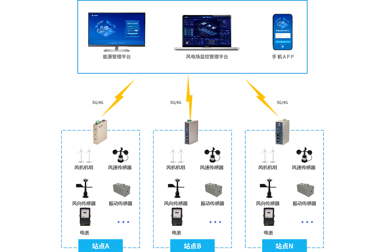 顺利获得yth游艇会yth206的工业智能网关采集风力发电场的每台风机和风速传感器、风向传感器、振动传感器等设备,将采集到的风机运行数据(如转速、功率、温度等)传输至风电场监控管理平台。平台对数据进行实时分析,监测风机运行状态,当检测到故障或异常时及时发出预警,并给予故障诊断和维修建议。同时支持远程控制风机启停、调整参数等操作,以及优化发电调度。