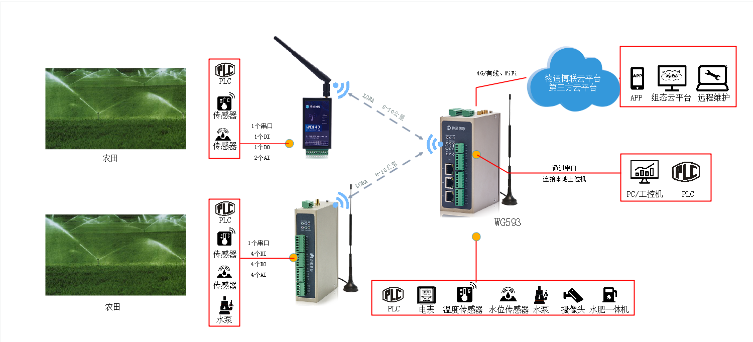 yth游艇会yth206的水肥一体化方案是顺利获得LORA数采终端WD140或WD240与农田现场的温湿度传感器、PLC、水肥一体机等设备连接,同时可以顺利获得工业智能网关WG593获取数据,并顺利获得4G/WIFI等方式上网,MQTT方式上传数据,将数据传到yth游艇会yth206数据云平台或第三方平台,云平台实时监控现场设备和水肥一体机的实时运行状态,实现电脑端和手机端的远程监控和控制,监控整个农田的运行情况,科学合理的安排灌溉施肥计划,实现农田自动化灌溉与施肥。