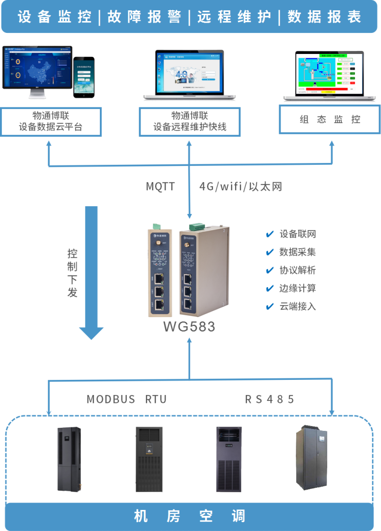 机房现场的恒温加湿精密空调设备顺利获得RS485串口连接到工业智能网关WG583,网关实时采集设备数据并顺利获得4G/WIFI/以太网等方式上传到IOT云平台。顺利获得IOT云平台,用户可以随时查看设备运行状态、技术参数、组态监控画面并远程控制设备启停。当设备异常或者故障时,系统会自动报警,并将故障报警信息自动顺利获得手机、邮件、微信等方式通知管理人员,管理人员能够及时对设备进行远程维护或者现场维护,实现机房空调的智能管理控制,从而保证现场环境温湿度的恒定安全。