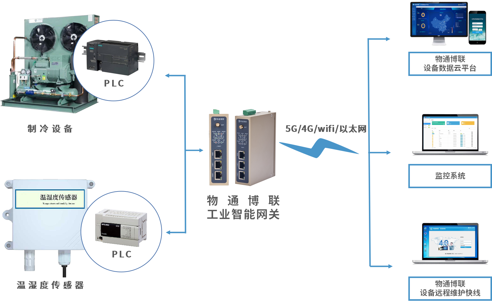 无论是食品冷链中的生产、运输还是存储环节,需要监测的设备都是制冷设备与传感器。顺利获得将yth游艇会yth206工业智能网关接入制冷设备PLC与温湿度传感器,网关就能实时采集温湿度、压力及电压、电流等数据,并顺利获得5G/4G/WIFI/以太网等网络将数据传输到云端监控平台。