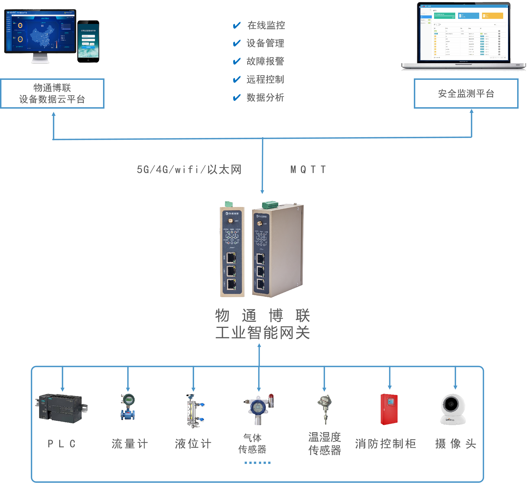 yth游艇会yth206工业智能网关支持接入液位计、流量计、温湿度传感器、气体传感器及消防控制柜PLC等设备,实时采集液位、流量、温湿度、危险气体浓度及消防柜运行状态等数据,并顺利获得5G/4G/WIFI/以太网的方式对接到油库储量安全监测平台或国家监管中心内,快速搭建分布式多站点的监控网络,操作简单、配置方便。